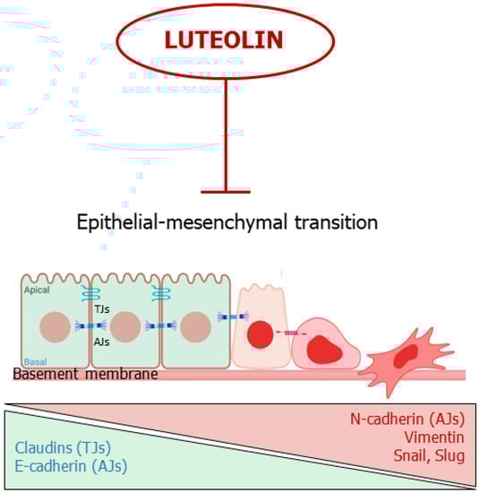 As aforementioned, luteolin inhibits or prevents cell invasion and metastasis in several cancer types, due to a modulation of EMT []. In this regard, both in vitro and in vivo studies demonstrated that treatment of highly metastatic triple-negative breast cancer (TNBC) with luteolin reduced β-catenin expression and downregulated mesenchymal markers, such as N-cadherin, vimentin, Snail and Slug []. Moreover, cancer cells regained their epithelial features by overexpressing cell-cell junctional proteins, such as E-cadherin and claudins [].