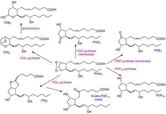 Conversion of cyclooxygenase endoperoxide products to different eicosanoids. The example shown is for PGH2 as formed from arachidonic acid. Arachidonic acid is first converted to the cyclooxygenase endoperoxide product PGH2. This, in turn, can form the prostaglandins PGE2 or PGF2α, prostacyclin PGI2 or thromboxanes TXA2 and TXB2.