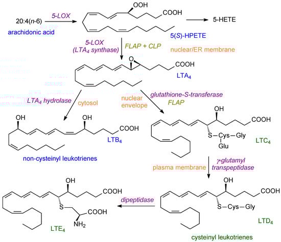 5-LOX is involved in the formation of leukotrienes (Figure 2) and is expressed mainly in cells of myeloid origin. In resting cells, 5-LOX is a soluble enzyme in the cytosol. After cell activation, it co-migrates with PLA2 to the endoplasmic reticulum [19]. It can also interact with cytosolic phospholipase A2 and can be phosphorylated at multiple sites [21]. Moreover, after phosphorylation, 5-LOX can translocate to the nuclear envelope [39]. 5-LOX catalyses a two-step concerted reaction with two accessory proteins (5-lipoxygenase activating protein (FLAP), coactosin-like protein (CLP)) being needed [21]. The product from ARA is LTA4 and this can then form LTB4 or, alternatively, the cysteinyl leukotrienes (Figure 2).