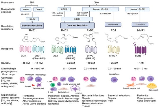 - Chiang, N.; Serhan, C.N. Structural elucidation and physiological functions of specialised pro-resolving mediators and their receptors. Mol. Asp. Med. 2017, 58, 114–129. [Google Scholar] [CrossRef] [PubMed]