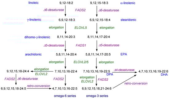 - Sprecher, H. Metabolism of highly unsaturated n-3 and n-6 fatty acids. Biochim. Biophys. Acta 2000, 1486, 219–231. [Google Scholar] [CrossRef] [PubMed]