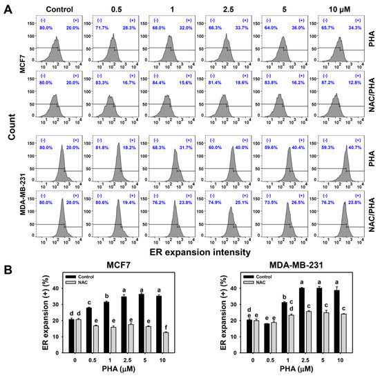 After treating with PHA (control, 0.5, 1, 2.5, 5, and 10 μM), the ER expansion intensity was determined by flow cytometry (Figure 1A). PHA upregulated ER expansion (+) (%) of breast cancer cells (MCF7 and MDA-MB-231) in a dose-response manner (Figure 1B), alleviated by N-acetylcysteine (NAC) pretreatment (ROS inhibitor). This result suggests PHA promotes ER expansion of breast cancer cells mediated by ROS.