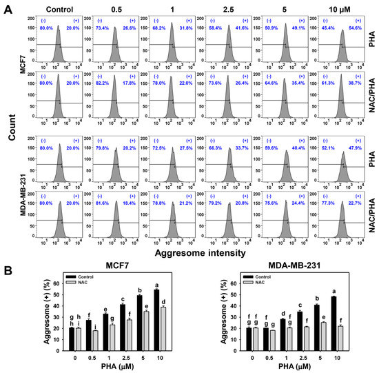 PHA promotes aggresome formation in breast cancer cells. (A,B) Pattern and quantification of aggresome formation analysis. After NAC pretreatment, cells were treated with 0 (0.1% DMSO), 0.5, 1, 2.5, 5, and 10 μM PHA for 24 h. (+) proportion was marked for aggresome aggregation (+) (%). For multiple comparisons, treatments displaying nonoverlapped letters have significant results of the same cell lines (p < 0.05) based on One-way ANOVA and Turkey HSD Post-Hoc Tests.