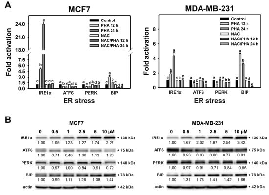PHA promotes mRNA and protein expressions of ER stress-responsive genes in breast cancer cells. (A) Fold activation of mRNA expression for IRE1α, ATF6, PERK, and BIP genes. After NAC pretreatment, cells were treated with 0 (0.1% DMSO) and 10 μM PHA for 12 and 24 h, namely NAC, NAC/PHA 12 h, and NAC/PHA 24 h. Except for NAC, the treatments for PHA only were the same as NAC/PHA treatment, i.e., control, PHA 12 h, and PHA 24 h. For multiple comparisons of the same gene, treatments displaying nonoverlapped letters have significant results of the same cell lines (p < 0.05) based on One-way ANOVA and Turkey HSD Post-Hoc Tests. (B) Western blotting for ER stress-responsive genes (IRE1α, ATF6, PERK, and BIP). Cells were treated with 0 (0.1% DMSO), 0.5, 1, 2.5, 5, and 10 μM PHA for 24 h. The values under bands indicate the relative protein expression compared with the control β-actin.