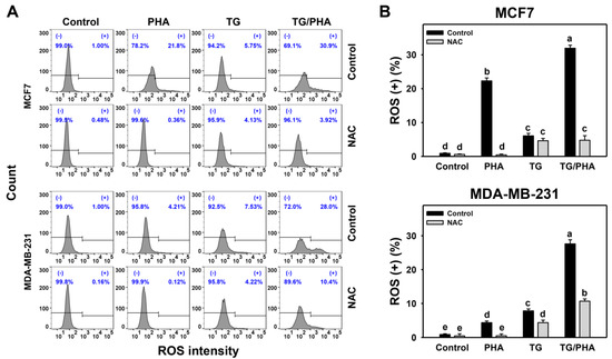 Thapsigargin (TG) promoted PHA-induced ROS generation in breast cancer cells. (A,B) Pattern and quantification of ROS analysis. After NAC pretreatment, cells were treated with 0 (0.1% DMSO), PHA (2.5 μM), TG (0.1 μM), or TG/PHA for 24 h. TG/PHA is the co-treatment of TG (0.1 μM)/PHA (2.5 μM). (+) proportion was marked for high ROS (+) (%). For multiple comparisons, treatments displaying nonoverlapped letters have significant results of the same cell lines (p < 0.05) based on One-way ANOVA and Turkey HSD Post-Hoc Tests.