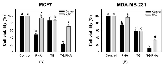 TG promoted PHA-induced antiproliferation in breast cancer cells. (A,B) ATP-based cell viability. After NAC pretreatment, cells were treated with 0 (0.1% DMSO), PHA (2.5 μM), TG (0.1 μM), or TG/PHA for 24 h. TG/PHA is the co-treatment of TG (0.1 μM)/PHA (2.5 μM). For multiple comparisons, treatments displaying nonoverlapped letters have significant results of the same cell lines (p < 0.05) based on One-way ANOVA and Turkey HSD Post-Hoc Tests.