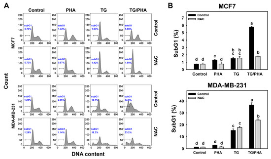 TG promoted PHA-induced subG1 accumulation in breast cancer cells. (A,B) Pattern and quantification of cell cycle analysis. After NAC pretreatment, cells were treated with 0 (0.1% DMSO), PHA (2.5 μM), TG (0.1 μM), or TG/PHA for 24 h. TG/PHA is the co-treatment of TG (0.1 μM)/PHA (2.5 μM). The subG1 proportion was marked for subG1 (%). For multiple comparisons, treatments displaying nonoverlapped letters have significant results of the same cell lines (p < 0.05) based on One-way ANOVA and Turkey HSD Post-Hoc Tests.