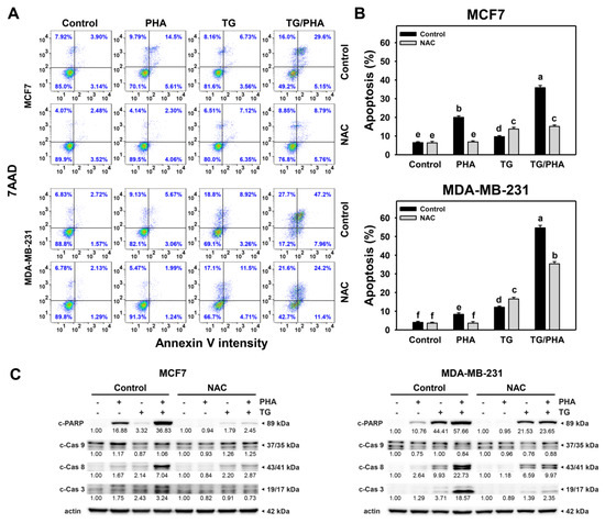 TG promoted PHA-induced apoptosis in breast cancer cells. (A,B) Pattern and quantification of annexin V/7AAD analysis. After NAC pretreatment, cells were treated with 0 (0.1% DMSO), PHA (2.5 μM), TG (0.1 μM), or TG/PHA for 24 h. TG/PHA is the co-treatment of TG (0.1 μM)/PHA (2.5 μM). Annexin V (+)/7AAD (+)/(−) proportions were counted for apoptosis (+) (%). For multiple comparisons, treatments displaying nonoverlapped letters have significant results of the same cell lines (p < 0.05) based on One-way ANOVA and Turkey HSD Post-Hoc Tests. (C) Western blotting for apoptosis genes (cleaved PARP (c-PARP), c-Cas 3, c-Cas 8, and c-Cas 9). The values under bands indicate the relative protein expression compared with the control β-actin.
