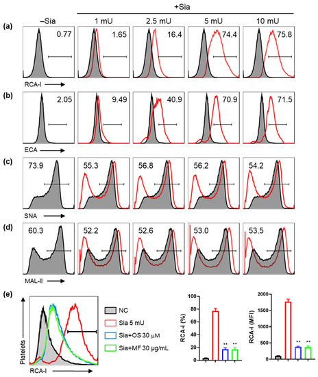 Figure 1. RCA-I, ECA, SNA, and MAL-II binding and inhibitory effects of MF on platelet desialylation in washed platelets exposed to sialidase. Washed platelets were subjected to treatment without sialidase (−Sia) or with varying concentrations of sialidase (+Sia; 1, 2.5, 5, and 10 mU) for 30 min at 37 °C. Following the treatment, the binding of platelets to (a) RCA-I, (b) ECA, (c) SNA, and (d) MAL-II was confirmed using flow cytometry (FACS). (e) Washed platelets were treated with sialidase and MF or OS, and RCA-I binding was measured. Representative FACS data from one of three separate experiments are shown. The bar graphs presented indicate mean ± standard deviation (SD) of three samples. All experiments were repeated thrice, and similar outcomes were observed. ** p < 0.01 compared with the Sia 5 mU group. RCA-I, Ricinus communis-1 agglutinin lectin; ECA, Erythrina crista-galli lectin; SNA, Sambucus nigra lectin; MAL-II, Maackia amurensis lectin II; MFI, mean fluorescence intensity; MF, Myristica fragrans; OS, oseltamivir phosphate; NC, negative control.