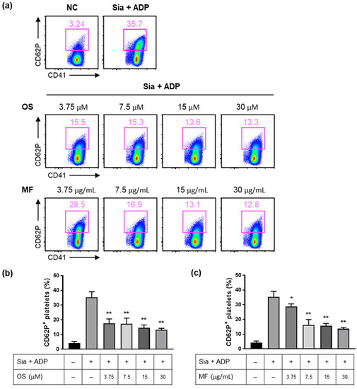 Sialidase exposure results in platelet hyper-reactivity via platelet desialylation and promotes the ADP-mediated platelet activation pathway [21]. We investigated whether MF inhibits ADP-dependent platelet activation via sialidase inhibition. Washed platelets were treated with sialidase and stimulated with ADP, and the expression of P-selectin (CD62P), a marker for platelet activation, was measured using flow cytometry. Compared with untreated platelets, those treated with sialidase–ADP showed a significant increase in P-selectin expression (Figure 2a). Pretreatment with MF and OS significantly reduced the expression of p-selectin induced via sialidase–ADP in a concentration-dependent manner (Figure 2a–c). The results indicate that MF can prevent platelet activation mediated via ADP through inhibiting desialylation of the platelets.