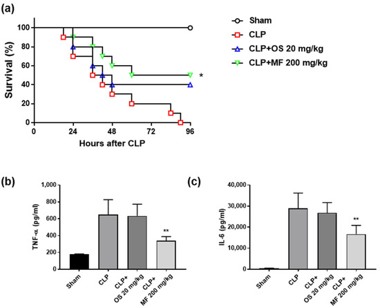 Figure 3. Effects of MF on the survival of and inflammation in cecal ligation and puncture (CLP)-induced septic mice. (a) MF (200 mg/kg) and OS (20 mg/kg) were administered orally for 3 days before the CLP procedure, and survival was monitored every 8 h daily for up to 4 days after CLP. (b,c) Serum TNF-α and IL-6 levels in each group were measured using ELISA. Values are presented as mean ± SD (n = 5 mice). * p < 0.05 and ** p < 0.01 compared with the CLP group. MF, Myristica fragrans; OS, oseltamivir phosphate.