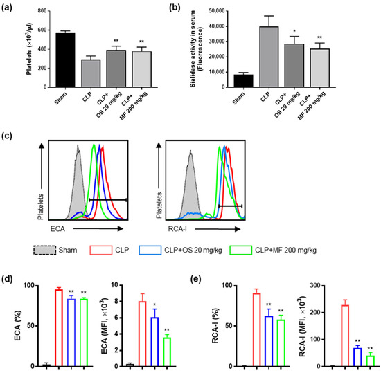 Figure 4. Effect of MF on platelet desialylation and thrombocytopenia in cecal ligation and puncture (CLP)-induced septic mice. (a) Circulating platelet count. (b) Sialidase activity was measured in the serum of each group of mice. (c) Platelets isolated and washed from mice in each group were stained for CD41, ECA, and RCA-I, and platelet desialylation was analyzed using flow cytometry. (d) Bar graphs for the percentage of ECA binding and MFI on platelet surface in each group. (e) Bar graphs for the percentage of RCA-I binding and MFI on platelet surface in each group. The data are presented as mean ± standard deviation (SD) with a sample size of five mice per group. Representative FACS data from one of three separate experiments are shown. * p < 0.05 and ** p < 0.01 compared with the CLP group. MF, Myristica fragrans; OS, oseltamivir phosphate; ECA, Erythrina crista-galli lectin; RCA-I, Ricinus communis-1 agglutinin lectin.