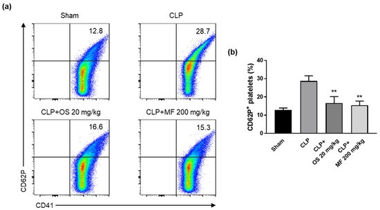To investigate the level of platelet activation during sepsis, we assessed P-selectin (CD62P) expression on the platelet surface using flow cytometry 24 h after the CLP procedure. Compared with that in the sham group, P-selectin expression on the platelet surface in the CLP group was significantly increased. In contrast, the expression of p-selectin was significantly reduced in the CLP + MF and CLP + OS groups compared with the CLP group (Figure 5a,b). The results suggest that MF exerted a suppressive effect on platelet activation in vivo as well as in vitro. Thus, these findings demonstrated that MF is a potent inhibitor of platelet activation.
