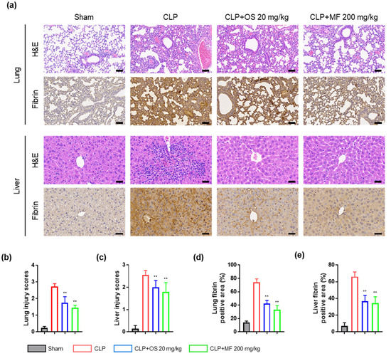 As a decrease in circulating platelet count in sepsis is associated with the microvascular thrombosis with platelet-rich thrombi, likely contributing to organ failure and ischemic complications [32,33], we investigated organ damage and fibrin deposition in mice with CLP-induced sepsis. Sepsis-induced lung and liver damage and failure are major complications that directly contribute to disease progression and mortality [34,35]. Therefore, we histologically evaluated the lung and liver tissues in all experimental mice. As expected, mice with CLP-induced sepsis showed significant necrosis, interstitial edema, inflammatory cell infiltration, and hemorrhage in the lung tissue stained with hematoxylin and eosin (H&E). However, treatment with MF and OS markedly reduced the extent of these histological changes (Figure 6a,b). In addition, CLP mice showed hepatocellular necrosis, vacuolization, and inflammatory cell infiltration in the liver. However, these pathological changes were alleviated in the liver tissues of mice in the CLP + MF and CLP + OS groups (Figure 6a,c). Next, we investigated the appearance of platelet-rich thrombi in organ microvessels, which is associated with reduced circulating platelet count, through detecting fibrin deposition using immunohistochemistry. The MF and OS treatments markedly suppressed fibrin deposition in the liver and lungs in CLP-induced septic mice (Figure 6a,d,e).