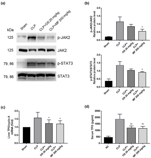 Figure 7. Effects of MF on hepatic JAK2/STAT3 signaling and TPO expression in CLP-induced septic mice. (a) Phosphorylated JAK2 and STAT3 levels in the liver tissue were analyzed using Western blotting (b) Western blot signals of phosphorylated JAK2 and STAT3 were normalized to those of total JAK2 and STAT3. Relative expression of phosphorylated JAK2 and STAT3 was quantified based on three independent experiments. (c) The expression of liver TPO mRNA was determined using qPCR. (d) The serum TPO level was quantified using ELISA. The data are presented as mean ± standard deviation (SD) with a sample size of five mice. * p < 0.05 and ** p < 0.01 compared with the CLP group. MF, Myristica fragrans; OS, oseltamivir phosphate; JAK2, Janus kinase 2; STAT3, signal transducer and activator of transcription 3; TPO, thrombopoietin.