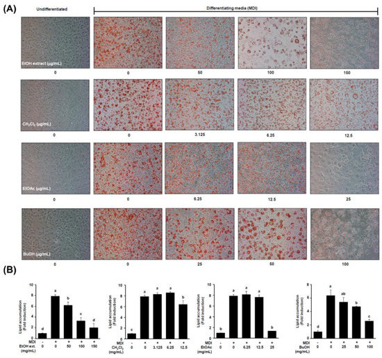 Anti-adipogenic effects of S. sieboldii ethanol (EtOH) extract and three solvent fractions. 3T3-L1 cells were treated with varied concentrations of crude EtOH extract and solvent fraction from start of adipocyte differentiation (designated day 0) for eight days. (A) The representative Oil Red O staining pictures of differentiated adipocytes after eight days. (B) Quantitative analysis of Oil Red O staining levels. Values are represented as means ± SD of 3 experiments. Differences among groups were determined by one-way ANOVA followed by Tukey’s post-hoc test; the different superscript letters (a–d) are significantly different from each group (p < 0.05). MDI: 3-isobutyl-1-methylxanthine (IBMX), dexamethasone (DEX), and insulin.