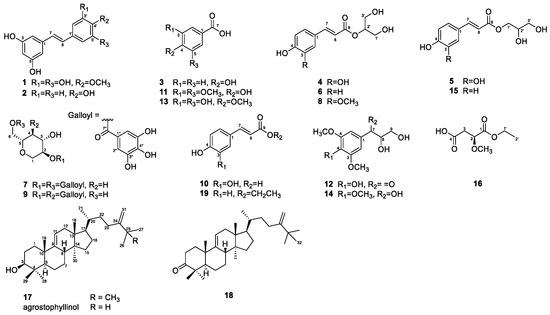 The 16 known compounds were identified as trans-3,3′,5,5′-tetrahydroxy-4-methoxystilbene (1) [32], resveratrol (2) [33], 4-hydroxybenzoic acid (3) [34], 2-O-caffeoylglycerol (4) [35], 1-O-caffeoylglycerol (5) [36], juncusyl ester B (6) [37], acertannin (7) [38], 2-O-(E)-feruloyl glyceride (8) [39], maplexin D (9) [40], trans-caffeic acid (10) [41], syringic acid (11) [42], 1-syringoyl-1,2-dihydroxyethane (12) [43], 3,5-dihydroxy-4-methoxybenzoic acid (13) [44], 1-(3,4,5-trimethoxyphenyl)-1,2,3-propanetriol (14) [45], 1-O-trans-ρ-coumaroylglycerol (15) [37], and trans-ρ-ethyl coumarate (19) [46] by comparing their spectroscopic data with reference values from the previously published literature. To the best of our knowledge, this is the first study to isolate all the compounds from S. sieboldii. Seven compounds (1, 4, 7–9, 12, and 13) were identified in the Smilacaceae family for the first time.