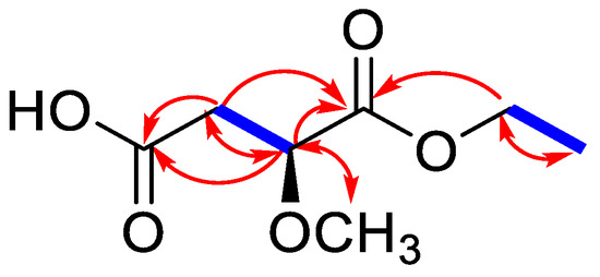Compound 16 was isolated as a white amorphous powder with optical rotation of −4.8° (c = 0.14, MeOH). The molecular formula of C7H12O5 was established from its high-resolution ESI-MS analysis (m/z 199.0575 [M + Na]+, calculated for C7H12O5Na: 199.0577), indicating two degrees of unsaturation. 1H NMR and distortionless enhancement by polarization transfer (DEPT) spectra in combination with the heteronuclear single quantum coherence (HSQC) spectrum revealed characteristic signals of the malic acid moiety [δH 4.16 (1H, dd, J = 8.4, 4.2 Hz), 2.71 (1H, d, J = 16.1, 4.2 Hz), and 2.60 (1H, d, J = 16.1, 8.4 Hz); δC 174.7 (s), 173.5 (s), 78.6 (d), and 39.4 (t)] [27,28]. In addition, the 1H and 13C NMR data of 16 showed the presence of a methoxyl group [δH 3.41 (3H, s); δC 59.0 (q)], one oxygenated methylene signals [δH 4.22 (1H, dd, J = 7.0, 2.8 Hz) and 4.20 (1H, dd, J = 7.0, 3.5 Hz); δC 62.4 (t)], and a methyl group [δH 1.28 (3H, t, J = 7.0 Hz); δC 14.6 (q)] (Table 1, Figures S31–S36). Spin–spin coupling was observed as a cross-peak between the oxygenated methylene signals (δH 4.22 and 4.20) and the methyl signal (δH 1.28) in the 1H-1H correlation spectroscopy (COSY) spectrum, representing the ethoxy group (Figure 3). In the heteronuclear multiple bond correlation (HMBC) spectrum, the correlations between the methoxy group proton at δH 3.41 and C-2 (δC 78.6) confirmed that the methoxy group was linked to C-2, and the HMBC correlation of the oxygenated methylene protons (δH 4.22 and 4.20) and C-1 (δC 173.5) indicated that the ethoxy group was connected at C-1. Based on the above results, the structure of 16 was identified as 1-ethyl-2-methoxy malate and was named sieboldic acid.