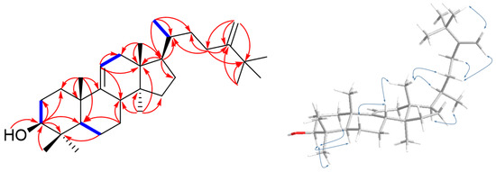 Compound 17 was isolated as white amorphous powder and displayed a positive Liebermann–Burchard reaction. Its molecular formula was determined to be C32H54O from the molecular ion at m/z 455.4275 [M + H]+ based on HR-ESIMS, indicating six indices of hydrogen deficiency. The IR spectrum showed absorption bands at hydroxyl (3382 cm−1) and terminal double bond (3043, 1371, and 890 cm−1) functionalities [29]. The 1H-NMR spectrum of 17 (Table 2) indicated the presence of eight tertiary methyls [δH 1.03, 0.97, 0.80, 0.73, 0.64 (3H each, s), and 1.04 (3H × 3, s)], one secondary methyl [δH 0.90 (3H, d, J = 6.3 Hz)], one axial methine proton bearing a hydroxy [δH 3.20 (1H, dd, J = 11.2, 4.2 Hz)], two germinal olefinic protons [δH 4.82, 4.65 (1H each, s)], and a typical H-11 proton of lanosta-9(11)-ene [δH 5.21 (1H, d, J = 5.6 Hz)]. The 13C-NMR spectrum of 17 revealed 32 carbon signals, which were identified with the aid of a DEPT experiment as four methines (δC 52.7, 51.2, 42.0, and 36.71), one oxygenated methine (δC 79.1), nine methylenes (δC 37.4, 36.69, 36.3, 34.1, 28.4, 28.3, 28.2, 28.0, and 21.6), nine methyls (δC 29.6 × 3, 28.5, 22.5, 18.73, 18.71, 15.9, and 14.6), five quaternary carbons (δC 47.2, 44.5, 39.6, 39.3, and 36.5), and four olefinic carbons (δC 159.2, 148.7, 115.2, and 105.9). Based on these NMR features and a comparison of 1H and 13C-NMR data for 17 and agrostophyllinol, isolated from Agrostophyllum brevipes [30], it was confirmed that these two compounds have a same plane skeleton [lanost-9(11)-ene skeleton, observed in C-3, C-5, C-9, C-10, C-11, C-13, C-14, C-17, C-18, C-21, and C-30 (∆δC +0.2, +0.2, +0.2, +0.6, +0.3, +0.2, +0.2, +0.3, +0.3, +0.3, +0.4 (∆δC = δ17 − δlanost-9(11)-ene))]. Moreover, the HMBC correlations of the five individual tertiary methyl signals on rings A-D [between CH3-18 (δH 0.64) and C-12 (δC 37.4), C-13 (δC 44.5), C-14 (δC 47.2), and C-17 (δC 51.2); between CH3-19 (δH 1.03) and C-1 (δC 36.3), C-5 (δC 52.7), C-9 (δC 148.7), and C-10 (δC 39.6); between CH3-28 (δH 0.97) and C-4 (δC 39.3), C-3 (δC 79.1), C-5, and C-29 (δC 15.9); between CH3-29 (δH 0.80) and C-3, C-4, C-5, and C-28 (δC 28.5); between CH3-30 (δH 0.73) and C-8 (δC 42.0), C-13, C-14, and C-15 (δC 34.1)] and HMBC cross-peaks between H-11 (δH 5.21) and C-8, C-9, C-10, C-12, and C-13 firmly established the linkages of these partial structural units (Figure 4). The only distinction between them was the presence of an additional methyl group at C-25 of the side chain in compound 17. This was supported by the singlet signal of three chemically equivalent methyl groups [δH 1.04 (3H × 3, s, H-26, H-27, H-32)] observed in the 1H-NMR spectrum of 17, which revealed the HMBC correlations with C-24 (δC 159.2) and ROESY correlations with H-31 (δH 4.82), elucidating the structure of the side chain as CH(CH3)CH2CH2C(CH2)C(CH3)3 (Figure 4). The relative configuration for 17 was determined as follows: first, the large coupling constant of H-3 (J2–3 = 11.2, 4.2 Hz) indicated that the hydroxyl group (3-OH) was oriented equatorially (β-position) at C-3 [29,31]. Next, the ROESY correlations between H-18 (δH 0.64) and H-20 (δH 1.39); and H-17 (δH 1.61) and H-21 (δH 0.90) were determined as R configuration for the stereochemistry of C-20. Thus, compound 17 was accordingly determined as 25-methyl-24-methylenelanost-9(11)-en-3β-ol and was given the trivial name smilaxsiebolane A.