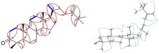 Compound 18 was obtained as white amorphous powder and exhibited a deprotonated molecular ion peak at m/z 453.4070 [M + H]+ (calcd for C32H53O, m/z 453.4091) on the HRESI-MS analysis, indicating its elemental formula as C32H52O. The molecular formula revealed seven indices of hydrogen deficiency. The following 1H-NMR and HSQC analysis revealed one olefin proton [δH 5.29 (1H, d, J = 6.3 Hz)], eight tertiary methyls [δH 1.23, 1.08, 1.07, 0.75, 0.68 (3H each, s), and 1.06 (3H × 3, s)], one secondary methyl [δH 0.93 (3H, d, J = 6.3 Hz)], two germinal olefinic protons [δH 4.84, 4.67 (1H each, s)], and four methines (δH 2.22, 1.65, 1.43, and 1.37) (Table 2). The 13C-NMR data, in accordance with HRESI-MS data, showed 32 carbon signals, including one ketone carbon (δC 217.2), nine methyls (δC 29.3 × 3, 25.6, 22.0, 21.8, 18.5, 18.4, and 14.4), four olefinic carbons (δC 159.0, 147.1, 116.3, and 105.8), four methine carbons (δC 53.4, 50.9, 41.9, and 36.5), nine methylenes (δC 37.2, 36.7, 36.4, 34.9, 33.9, 28.2, 28.0, 27.7, and 22.6), and five quaternary carbons (δC 47.7, 47.0, 44.3, 39.1, and 36.3) (Table 2). The 1H- and 13C-NMR spectra of 18 were comparable to those of 17, with the exception of the presence of a ketone functional group at δC 217.2 (C-3) and, meanwhile, the disappearance of the H-3 proton signal. As anticipated, the 1H NMR spectrum of 18 is absent of the signal at δH 3.20 (hydroxy methine proton of compound 17) and instead displays two multiplet protons at δH 2.72 and 2.40, indicating a ketomethylene group. This assumption was validated by HMBC correlation of H-1 (δH 2.10 and 1.81), H-2 (δH 2.72 and 2.40), H-28 (δH 1.08), and H-29 (δH 1.07) with C-3 (δC 217.2) (Figure 5). Compound 18 has the same relative configuration as 17, confirmed by ROESY data (Figure 5) and positive specific rotation value +26.4° (c = 0.36, CH2Cl2). In conclusion, compound 18 was determined as 25-methyl-24-methylenelanost-9(11)-en-3-one and has been named smilaxsiebolane B.