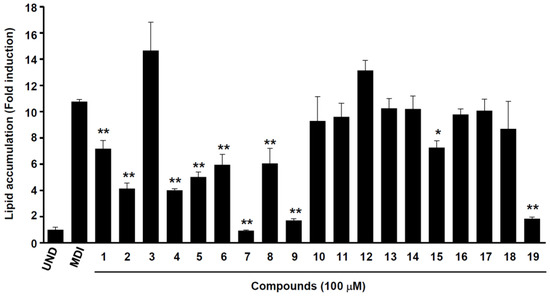 The cell viability was analyzed by MTT cytotoxicity assays [11]. The 3T3-L1 preadipocytes were seeded at a density of 5 × 103 cells/well in 100 μL of culture medium. A time-zero control plate was prepared one day after plating. The isolated compounds (1–19) were applied directly, and the cells were incubated for 24 h in a humidified atmosphere with 5% CO2 at 37 °C. The proliferation of the cells was then determined. MTT [5 mg/mL in phosphate-buffered saline (PBS)] solution was added to the wells, followed by incubation for 3 h. The medium was removed from the wells by aspiration, and buffered dimethyl sulfoxide (DMSO, 0.1 mL) was added to each well, after which the plates were shaken. Subsequently, absorbance was measured using a SpectraMax 190PC microtiter plate reader at 540 nm.