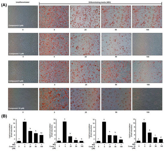 Dosage-dependent research of active compounds, 2-O-caffeoylglycerol (4), acertannin (7), maplexin D (9), and trans-ρ-ethyl coumarate (19) on lipid accumulation in adipocytes. (A) The representative Oil Red O staining pictures of differentiated adipocytes on day 8. (B) Quantitative analysis of Oil Red O staining contents. Differences among groups were determined by one-way ANOVA followed by Tukey’s post-hoc test; the different superscript letters (a–e) are significantly different from each group (p < 0.05). MDI: 3-isobutyl-1-methylxanthine (IBMX), dexamethasone (DEX), and insulin.