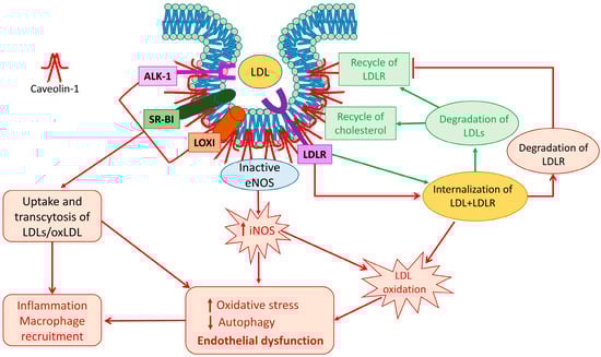 Caveolin-1 and LDL trafficking: a schematic representation of different fates of LDLs after Cav-1-mediated trafficking. Receptors for LDL and oxLDL are localized in caveolae. Their interaction with Cav-1 favors uptake and transcytosis of LDL and oxLDL. When LDL are internalized through LDLR (green lines), they are degraded and cholesterol and LDLR are recycled in the plasma membrane. However, when LDLR interacts with PCSK9, the complex LDL-LDLR is internalized through Cav-1 (red lines), and the LDLR is degraded. Expression of Cav-1 is strictly related to internalization and transcytosis of LDLs. The overload of LDLs, as well the imbalanced activity of eNOS and iNOS, induces LDL oxidation and decreases their degradation leading to increased oxidative stress and attenuation of autophagy, thus contributing to endothelial dysfunction. These events, in turn, activate production and release of inflammatory factors contributing to the establishment of an inflammatory environment and to the recruitment of macrophages, thus favoring the onset and progression of atherosclerosis.