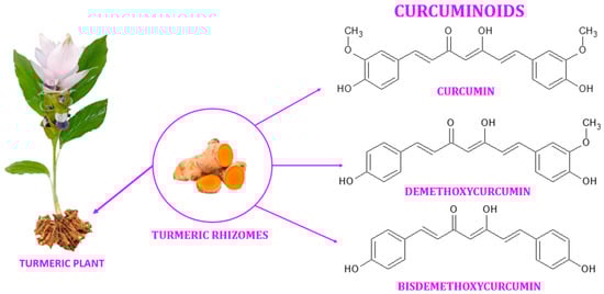 Turmeric (also known as Arab globe Curcuma, Haridra in Sanskrit, Chinese yellow ginger Jianghuang, Japanese Kyoo, or Ukon [1]) is a rhizomatous perennial plant [2] of the Zingiberaceae family [3] widely cultivated annually in tropical and subtropical regions of the world [4,5,6], the largest global producer of turmeric being India [1,4]. Curcuma longa is the most commonly recognized species within the genus Curcuma. However, other species exist within this genus, namely Curcuma amada, Curcuma zedoaria, Curcuma aromatica, and Curcuma rakatakanta [7]. At maturity, turmeric can reach a height of one meter. Its leaves are long, rectangular, and placed in two rows from which leaf sheaths and false stems, petioles, and leaf blades are formed. With a length between 2.5–7 cm and a diameter of approximately 2.5 cm, the rhizomes are roughly segmented and have a specific fragrance. Depending on the shape, two types of rhizomes are distinguished: the primary rhizomes that have a pear shape and are also known as bulbs, and the secondary rhizomes that have a cylindrical shape. The flowers are 10–15 cm long, have a matte yellow color, and are arranged in spike-like structures [8]. Since ancient times, this yellow spice has been used in the Asian medicine of Ayurveda (which emerged about 5000 years ago), Siddha, Atharveda (2000 years ago), Unani medicine, and Chinese medicine [9,10]. During the 14th century, the Western world was introduced to the golden spice by early European explorers of the Asian continent [11]. Further, it was also used in religious cult rituals [3,12]. It is also a natural spice used as a colorant in curry, mustard [13], salads, pasta, yoghurt, cheese, and baked goods [14]. It is referred to as Natural Yellow 3 as an ecological dye and has been given the E designation E100 when used as a food coloring ingredient [15]. Turmeric is made up of 69.4% carbohydrates, 13.1% moisture, 6.3% protein, 5.1% fat, and 3.5% minerals. The essential oil, with a proportion of 5.8%, contains, among other compounds, curcumin (C21H20O6) [12], a significant curcuminoid found in the rhizomes of turmeric that gives it its yellow color [16,17]. The other curcuminoids are demethoxycurcumin (C20H18O5) and bisdemethoxycurcumin (C19H16O4), which are present in lower concentrations (Figure 1) [18]. Depending on the geographical cultivation area, curcuminoids amount to around 30–150 mg/g of the turmeric rhizome [19]. Curcumin is biosynthesized from two molecules of feruloyl-CoA and one molecule of malonyl-CoA via two enzymatic conversions catalyzed by diketide-CoA synthase (DCS) and curcumin synthase. (CURS). DCS and CURS both belong to the family of type III polyketide synthases [20].