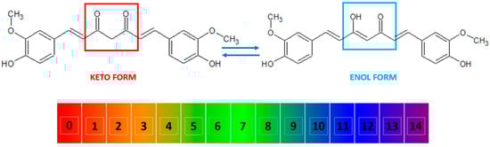 The keto and enol tautomers of curcumin and their reversible inter-conversion in aqueous medium as a function of pH. The numbers indicate the pH scale from 0 to 14. At low pH, the keto form (marked in red) is predominant, while at high pH, the enol form (marked in blue) predominates.