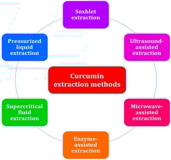 The process of curcumin extraction is a crucial step in the recovery of the bioactive compound from the plant matrix [38]. During the extraction process, specific solvents are used in accordance with predetermined procedures, leaving behind insoluble compounds [39]. Curcumin can be extracted using either conventional or advanced techniques. Since conventional extraction methods such as solvent extraction and Soxhlet extraction [7] require a considerable amount of time, organic solvents, cooling water [40], and energy [41], several researchers have applied novel extraction methods such as ultrasound-assisted extraction [42], microwave-assisted extraction [43], enzyme-assisted extraction [44], supercritical fluid extraction [45], and pressurized liquid extraction [46] (Figure 3). Regardless of the technique used, the preparation of the raw material prior to processing and the selection of the best parameters have a significant impact on the efficacy of the extraction technique and the quality of the extract. Typically, phytochemicals are more accessible and the matrix is more easily penetrated by the extraction solvent if the plant material is dried rather than fresh and finely ground as opposed to simply cut into pieces. The solvent-to-plant solid material ratio can also be decreased when the latter is finely pulverized, thus reducing costs [38]. Recirculating the solvent as in a Soxhlet extractor can also lead to the processing of a greater amount of material with less solvent cost and increased extraction yields, as can intense agitation, ultrasounds, microwaves, specific enzymes, or high pressures, as described below.