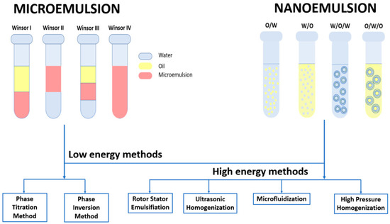 The distinction between microemulsions and nanoemulsions is that microemulsions are thermodynamically stable, whereas nanoemulsions are kinetically stable [190]. Another difference is how these systems are obtained: microemulsions are formed spontaneously without introducing energy from the outer environment, while nanoemulsions need mechanical outer force to develop nanodroplets [193].