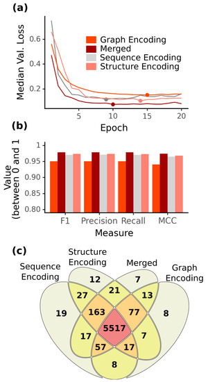 After epoch five, GrEnc consistently showed the highest validation loss and—comparing the overall lowest median validation loss for the other three models—a loss below 0.2, with the lowest for the MncR model (Figure 2a). In summary, all four models achieved a high accuracy (F1-score > 0.94), and for each model, recall and precision values were within 0.001 of each other, with precision always being marginally higher than recall. In the direct comparison using precision and recall of the best ML model for each encoding as well as the accuracy scores F1 and MCC, we observed a higher F1-Score of the SeqEnc model by ~0.02 as compared to the GrEnc model, while StrEnc improved the F1-score of the SeqEnc model even further by ~0.003 (Figure 2b). Interestingly, the combination of the two information layers SeqEnc and GrEnc in the MncR model led to an overall improvement of prediction accuracy by ~0.005, leading to an F1-score of 0.979 and an MCC of 0.974. From our balanced test dataset, 5517 of the 6001 sequences were correctly predicted by all four models. Furthermore, 5970 of the 6001 sequences were correctly predicted by at least one of the four models, of which 48 were correctly identified by only one model (Figure 2c). Focusing on the two information encoding methods involving the structure of the sequence, we observed that 12 structural and 8 graph sequences were correctly classified by only one of them. Notably, the MncR model was able to correctly predict many of the ncRNAs previously wrongly predicted by the GrEnc or SeqEnc model and also covered most of the sequences correctly predicted by the StrEnc model, even though this information layer was not explicitly added in the MncR model. The MncR model falsely classified overall only 2.15% of the full dataset.