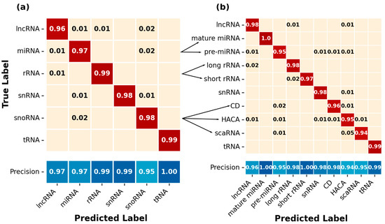 Classification and precision changes by subtype prediction in the MncR ML model for general classes and fine-grained classes. Confusion matrices (normalized to each row) for (a) general classes MncR and (b) fine-grained classes MncR are shown with true labels as rows and predicted labels as columns. The fraction of predictions is indicated by the number in each square as well as the color gradient (low value: beige; high value: dark red). Values below 0.005 are omitted from the matrices. Values on the main diagonal in each matrix are equivalent to the recall for this class. Precision values (between 0 and 1) for each ncRNA class are visualized by the blue color gradient below the confusion matrices.