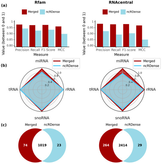 After optimizing the different ML models and including several sequence information layers, we wanted to compare our MncR model to the current best ncRNA classifiers, such as ncRDense [37]. In their comparison to the tools ncRDeep [36], nRC [34], ncRFP [35] and ncRNA_deep [42], they used the benchmark Rfam test set from nRC [34]. In general, ncRDense outperformed all other mentioned ncRNA classifiers in accuracy, sensitivity, specificity and F1-score by at least 0.0019 to 0.0047 for the second-best tool, ncRNA_deep [42]. As current classifiers such as nRC, ncRFP, ncRDeep and ncRDense classify a mix of ncRNA major classes (tRNA, Ribozyme) and subclasses (precursor miRNA, 5S rRNA, 5.8S rRNA, C/D-Box, H/ACA-Box, scaRNA) as well as cis-regulatory elements (Riboswitch, Leader, IRES, Intron-gpI, Intron-gpII), we had to adjust the benchmark dataset for a fair comparison. A similar approach was used with ncRDense to use ncRNA_deep for comparison, which is based on Rfam family prediction. For this reason, we had to restrict the Rfam dataset [34] to selected sequences with labels existing in both ncRNA prediction models, including tRNA, snoRNA (ncRDense: scaRNA, C/D-box, H/ACA-box), miRNA and rRNA (ncRDense: 5S rRNA, 5.8S rRNA). Furthermore, we excluded sequences longer than 750 nts as it is not possible for ncRDense to generate a prediction for these. Lastly, we excluded all sequences with similarities above 90% to the training datasets (see Material and Methods). For the remaining four classes, we had 1125 sequences split into 401 snoRNAs, 184 miRNAs, 347 rRNAs and 193 tRNAs for our benchmark Rfam test dataset. In addition, our updated RNAcentral test set was also restricted by the same criteria, reducing the number of eligible sequences in the test set from 6001 to 2737 (523 miRNAs, 952 snoRNAs, 993 tRNAs and 269 rRNAs) (Figure 5).