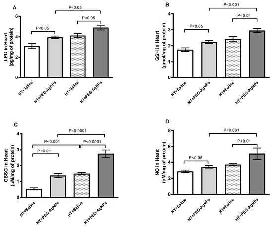 2.8. Lipid Peroxidation (LPO), Reduced Glutathione (GSH), Oxidized Glutathione (GSSG), and Total Nitric Oxide (NO) Concentrations in Heart