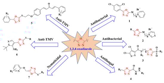 Bioactive structures containing a “1,3,4-oxadiazole” moiety. Compound 1 is from Wang et al., 2016 [14]. Compound 2 is from Wang et al., 2019 [15]. Compound 3 is from Xiang et al., 2020 [16]. Compound 4 is from Wu et al., 2019 [17]. Compound 5 is from Gan et al., 2015 [18] and Gan et al. [19], 2017. Compound 6 is from Yang et al., 2020 [20]. Compound 7 is from Chen et al., 2020 [21].
