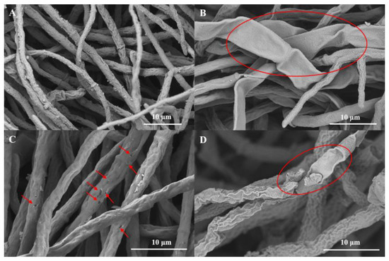 Morphological study of G. saubinetii treated with E13 at different dosages in PDB by SEM. (A) 0 mg/L (CK); (B) 2 eq. EC50; (C) 4 eq. EC50; (D) 8 eq. EC50.