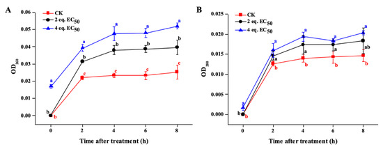 Further cytoplasmic content leakage assay confirmed the membrane of mycelia was damaged. Nucleic acid and protein concentrations in mycelial suspensions can be evaluated by measuring the changes in absorbance at 260 and 280 nm [23]. As shown in Figure 7, compared with the blank control (CK) group, the absorbance values at 260 and 280 nm were significantly increased within 2 h after treatment with 2 eq. and 4 eq. EC50 of compound E13 and stabilized at approximately 8 h. Therefore, it can be inferred that the nucleic acids and proteins of G. saubinetii mycelia were significantly released after treatment with E13, and the effect was dose-dependent. This result was consistent with the morphological observation by SEM and FM experiments. When treated with the title compound E13, the cell membrane integrity was damaged, and the nucleic acids and proteins were released, thereby inhibiting the growth of fungi.