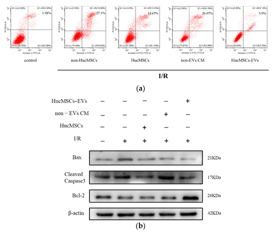 To investigate whether HucMSC-EVs protected the kidneys by inhibiting I/R-induced apoptosis, we used flow cytometry to measure the apoptosis rate of HK-2 cells treated under different conditions. The results depicted a significant increase in apoptosis in cells treated with I/R compared to control cells. However, co-culture with HucMSCs and treatment with HucMSC-EVs significantly inhibited cellular apoptosis (Figure 2a). Meanwhile, we found that HK-2 cells treated with I/R markedly increased the expression levels of cleaved caspase-3 and Bax and decreased the expression level of Bcl-2. Co-culturing with HucMSCs or treatment with HucMSC-EVs reversed the expression of these proteins (Figure 2b). In addition, we found that EV-removed CM group was significantly less potent against apoptosis than HucMSCs and HucMSC-EVs, whereas there were no obvious differences between HucMSC and HucMSC-EV groups in Bax and cleaved caspase-3 levels, indicating that the protective effects of HucMSCs were mediated by their EVs. These results suggested that HucMSC-EVs play a key protective role against I/R injury induced by HK-2 cell apoptosis.