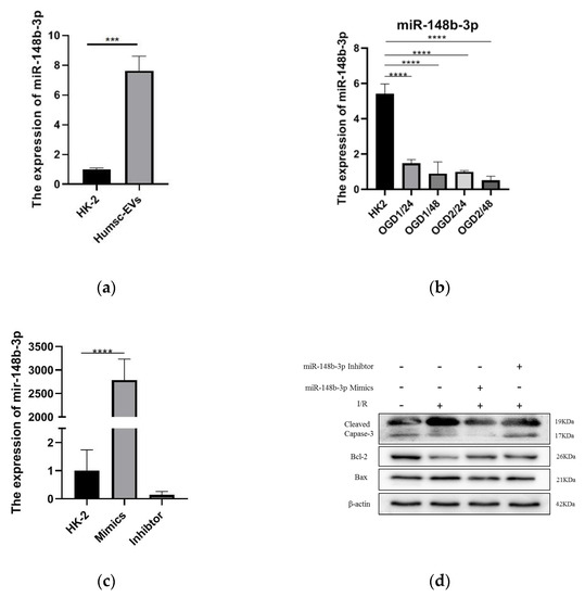 A recent study identified the miRNA landscape in HucMSC-EVs and showed that miR-148b-3p is enriched [21]. Thus, we measured miR-148b-3p expression levels in HucMSC-EVs and HK-2 cells, the results showed that the expression level of miR-148b-3p in HucMSC-EVs were higher than those in HK-2 cells (Figure 3a). Furthermore, we detected miR-148b-3p expression levels in HK-2 cells after I/R treatment at different time points and demonstrated that miR-148b-3p levels were significantly reduced after I/R treatment (Figure 3b). These data demonstrated that HK-2 cells contain miR-148b-3p. Therefore, we investigated the role of miR-148b-3p in I/R injury. First, miR-148b-3p mimics and inhibitors were administered to HK-2 cells, followed by I/R treatment. The results demonstrated that mimics and inhibitors of miR-148b-3p upregulated and downregulated their expression in HK-2 cells (Figure 3c). miR-148b-3p overexpression in HK-2 cells inhibits I/R injury-induced apoptosis. The expression levels of cleaved caspase-3 and Bax were decreased, whereas that Bcl-2 was increased. However, miR-148b-3p knockdown in HK-2 cells after I/R injury reversed the expression of these apoptosis-related proteins (Figure 3d). Accordingly, miR-148b-3p in EVs play a critical role in the HucMSC-EV-mediated inhibition of I/R-induced apoptosis.