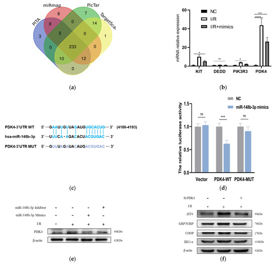 In order to further probe the molecular mechanisms of miR-148b-3p function in cell apoptosis, we screened for miR-148b-3p target genes on several websites, including PITA, PicTar, TargetScan, and miRanda (Figure 4a). In total, we identified 10 target genes predicted by the four online databases, of which DEDD, KIT, PIK3R3, and PDK4 were found to related to the apoptosis of I/R from literature review. Next, we used mimics to transfect miR-148b-3p into HK-2 cells and detected whether it could regulate in the expression of these mRNAs. The level of PDK4 was the most significantly changed (Figure 4b). We predicted putative binding sites of miR-148b-3p and PDK4 using starBase database. Notably, the luciferase reporter assay demonstrated that luciferase reporter activity was significantly reduced by miR-148b-3p overexpression compared to miRNA-NC. Furthermore, the activity of the PDK4-3′-UTR-mutant luciferase reporter was unaffected by the mimics of miR-148b-3p, suggesting that PDK4 was a direct target of miR-148b-3p (Figure 4c,d).