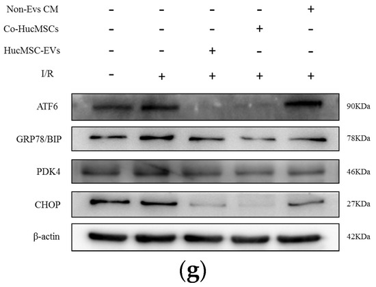 HK-2 cells co-cultured with non-EVs CM, HucMSCs, and HucMSC-EVs were processed I/R treatment for 24 h. Western blotting was performed to examine the relative protein expression. ATF-6, GRP78/BIP, and CHOP expression levels dramatically increased after I/R treatment, and their protein levels were downregulated (Figure 4g).