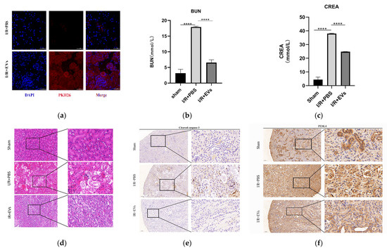 As displayed in Figure 5b,c, the levels of serum CREA and BUN, which reflect renal function, in group I/R+PBS were significantly higher than those in group I/R+EVs. Furthermore, HucMSC-EVs improved tubular dilatation, brush border loss, nuclear loss, and cast formation caused by I/R injury (Figure 5d). In addition, the levels of cleaved caspase-3 and PDK4 in vivo were detected by IHC. In addition to the in vitro experiments, the levels of cleaved caspase-3 and PDK4 were higher after I/R injury, and the expression of HucMSC-EVs was reduced (Figure 5e,f). These results indicated that HucMSC-EVs can mitigate I/R injury and downregulate the level of PDK4.