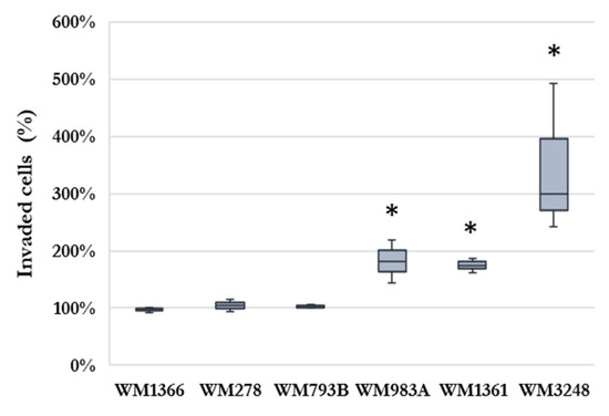 The effect of human hepatic sinusoidal endothelial cells conditioned media (HHSEC-CM) on the invasion of melanoma cell lines (WM1366, WM278, WM793B, WM983A, WM1361, and WM3248) compared to the effect of the unconditioned medium as a control. Results are presented as the ratio (mean ± SE, n = 3) of HHSEC-CM-induced and control invaded cells. The asterisk indicates a statistically significant difference between HHSEC-CM induced data and control data (Mann–Whitney test: * p < 0.05). The results of the invasion assay are shown as the mean of three independent experiments.