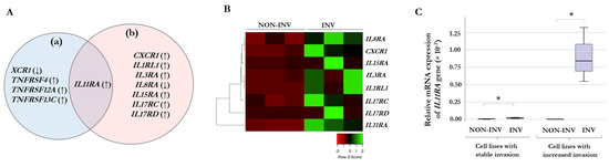 Association between chemokine- and cytokine-receptor expression of melanoma cells and the invasive capacity responding to human hepatic sinusoidal endothelial cells conditioned media (HHSEC-CM). (A) The Venn diagram illustrates the significant gene expression alterations in cell lines with stable invasiveness (a) and in those with increased invasiveness (b), indicating the IL11RA gene in the overlapping region of the two sets of gene expression. Arrows indicate overexpression (↑) and downregulation (↓) in the selected invasive cells compared to the non-invasive populations. (B) Unsupervised hierarchical clustering of the significantly differentially expressed genes in the melanoma cell lines with increased invasiveness. The separated non-invasive (NON-INV) and invasive (INV) cells are displayed vertically, and the genes are displayed horizontally. The heat map was generated from the seven significantly expressed genes using www.heatmapper.ca [25] accessed on 4 May 2023. (C) Relative mRNA expressions of the IL11RA gene in selected non-invasive and invasive cells according to the invasive capacity of the cell lines. The cell lines that exhibited stable invasiveness (left part) showed nearly imperceptible differences, while the cell lines with increased invasiveness (right part) demonstrated a significantly higher level of IL11RA. The data are presented as the mean ± SD of three independent experiments. An asterisk indicates statistically significant differences (Mann–Whitney–Wilcoxon test, * p < 0.05); the qRT-PCR results are presented as the mean ratio of 2−ΔCt values between invasive and non-invasive populations of three independent experiments.