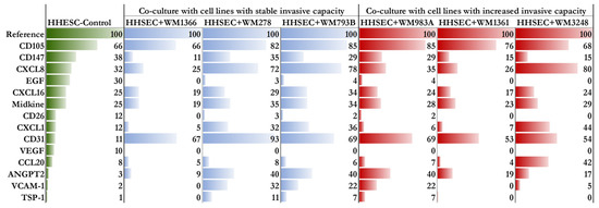 Proteome arrays (Proteome Profiler Human Chemokine Array Kit and Proteome Profiler Human XL Cytokine Array Kit) were used to detect protein expression differences between HHSEC before (HHSEC-Control) and after co-culturing with different melanoma-derived primary cell lines (HHSEC + WM1366, HHSEC + WM278, HHSEC + WM793B, HHSEC + WM983A, HHSEC + WM1361, and HHSEC + WM3248). Proteins with detectable differences (>10%) in at least one cell line revealed 15 differentially expressed proteins (including CD31, VCAM-1, ANGPT2, CXCL8, and CCL20) in the co-cultured HHSECs compared to the control (Figure 4). We observed remarkably higher expression of the CCL20 protein in HHSECs co-cultured with WM3248, suggesting a potential correlation between CCL20 expression and the invasive potential of WM3248 cells.