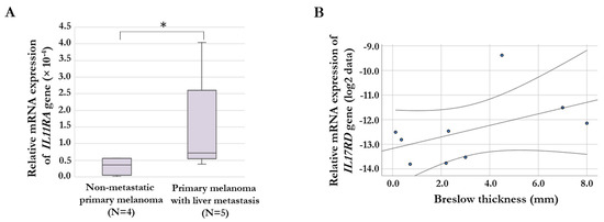 We were able to analyze the gene expression differences of chemokine- and cytokine-receptor genes for a small cohort of primary melanoma tissue samples (non-metastatic, n = 4; primary melanoma with liver metastasis, n = 5). We examined the expression of genes (CXCR1, IL1RL1, IL1RN, IL3RA, IL8RA, IL11RA, IL15RA, IL17RC, and IL17RD) that showed significant differences between invasive and non-invasive cells in the cell lines with increased invasiveness after culturing with HHSEC-CM. According to our qRT-PCR data, the relative expression level of the IL11RA gene was significantly higher in primary melanoma tissues with liver metastasis compared to primary melanoma without metastasis (Figure 5A). On the other hand, we analyzed the association of the gene expression of these receptor genes with the Breslow thickness (mm) of primary melanoma tissues. This analysis revealed a significant positive correlation for IL17RD gene expression (R = 0.777, p = 0.014; Figure 5B).