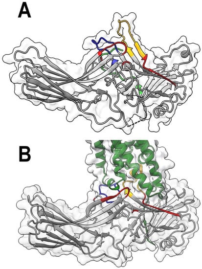The positions of targeted elements in free and rhodopsin-bound arrestin-1. (A). Arrestin-1 (molecule A in the crystal tetramer of bovine arrestin-1, PDB ID: 1cf1 [15]) with residues mutated in this study shown in red, the finger loop (residues 68–81) in yellow, and the middle loop (residues 132–142) in blue. The attached part of the arrestin-1 C-terminus resolved in structure is shown in bright green. (B). The structure of the mouse arrestin-1 complex with rhodopsin (complex A, PDB ID: 5w0p [11]). Arrestin-1 (gray) in all panels and rhodopsin (dark green) in panel (B) are shown as flat ribbon with molecular surface of arrestin-1 indicated. The direction (N-to-C) of β-strands is shown by arrows. Note that residue numbers in mouse arrestin-1 compared to bovine arrestin-1 are N + 1. Images were created in DS ViewerPro 6.0 (Dassault Systèmes, San Diego, CA, USA).