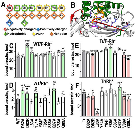 The functional role of β-strand VI residues. (A) The linear WT sequence of β-strand VI of bovine arrestin-1 is shown on top, with residues represented as octagons. Substituting residues used in this study are shown as rhombi. The chemical nature of the original side chain and its replacements is shown by color, as indicated. (B) The position of β-strand VI in the crystal structure of the arrestin-1 complex with rhodopsin [11,22]. The depiction of rhodopsin and arrestin-1 is the same as in Figure 1; the middle loop is shown in magenta, the rest of the color scheme is the same as in Figure 1. In addition, side chains of rhodopsin residue Gln237 and mouse arrestin residues 83–90 (homologous to bovine arrestin-1 residues 82–89) Asp-Leu-Tyr-Phe-Ser-Arg-Val-Gln are shown (note that in the bovine protein, Gln87 occupies the position of mouse Arg88). Residues are labeled using single letter code. Rhodopsin TM5, TM6, and helix-8 (H8) are indicated. The image was created in DS ViewerPro 6.0 (Dassault Systèmes, San Diego, CA, USA). (C–F) The binding of indicated mutants of WT arrestin-1 to P-Rh* (C) and Rh* (D), as well as the binding of truncated (Tr) arrestin-1-(1–378) with the same mutations to P-Rh* (E) and Rh* (F) was determined using radiolabeled arrestins produced in cell-free translation in the direct binding assay with purified phosphorylated or unphosphorylated light-activated bovine rhodopsin, as described in Methods. Full-length native bovine rhodopsin was used in all assays; WT and Tr refer to full-length arrestin-1 (1–403) and its truncated (1–378) form, respectively. Circles represent measurements in independent experiments, each performed in duplicate (n = 3–4). The binding was analyzed separately in each of the four groups. Statistical significance of the differences between parental WT (C,D) or Tr (E,F) (darker shaded bars in panels (C–F)) and mutants was determined by ANOVA followed by Dunnet post hoc test with correction for multiple comparisons and is indicated as follows: * p < 0.05; ** p < 0.01; *** p < 0.001. Bars showing statistically significant increases and decreases in binding are shaded light green and pink, respectively.