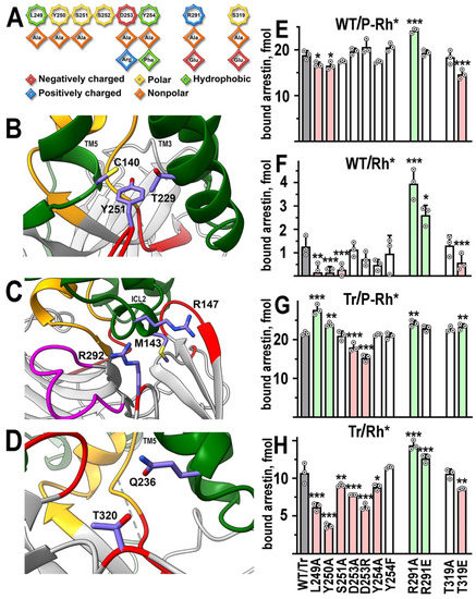 Functional role of rhodopsin-contacting residues in arrestin-1. (A) Linear WT sequence of the C-loop and other residues mutated in this study of bovine arrestin-1 are shown on top, with residues represented as octagons. Substituting residues used in this study are shown as rhombi. The chemical nature of the original side chain and its replacements is shown by color as indicated. (B–D) The positions of targeted arrestin-1 elements in the crystal structure of its complex with rhodopsin [11,22]. The depiction of rhodopsin and arrestin-1 is the same as in Figure 1; the middle loop is shown in magenta, the rest of the color scheme is the same as in Figure 1. In addition, the side chains of rhodopsin residues Cys140 and Thr229 are shown in (B), Met 143 and Arg147 in (C), and Gln236 in (D). Mouse arrestin-1 residues (corresponding numbers of bovine arrestin-1 residues are N-1) Tyr251 (B), Arg 292 (C), and Thr320 (D) are also shown. Residues are labeled using single letter code. Rhodopsin elements TM3 and TM5 (B), ICL2 (C), and TM5 (D) are labeled. Images in (B–D) were created in DS ViewerPro 6.0 (Dassault Systèmes, San Diego, CA, USA). (E–H) The binding of indicated mutants of WT arrestin-1 to P-Rh* (E) and Rh* (F), as well as the binding of truncated (Tr) arrestin-1-(1–378) with the same mutations to P-Rh* (G) and Rh* (H), were determined using radiolabeled arrestins produced in cell-free translation in the direct binding assay with purified phosphorylated or unphosphorylated light-activated bovine rhodopsin, as described in Methods. Circles represent measurements in independent experiments (n = 3), each performed in duplicate. The binding was analyzed separately in each of the four groups. Statistical significance of the differences between parental WT (E,F) or Tr (G,H) (darker shaded bars in panels (E–H)) and mutants was determined by ANOVA followed by Dunnet post hoc test with correction for multiple comparisons and is indicated, as follows: * p < 0.05; ** p < 0.01; *** p < 0.001. Bars showing statistically significant increases and decreases in binding are shaded light green and pink, respectively.